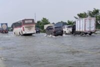 Mobil terlihat masih bisa melintasi banjir di jalan ini. Selain itu, bajaj juga terlihat bisa melintas.