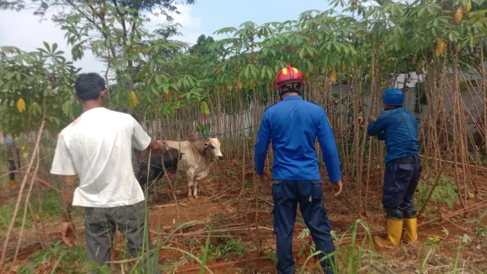 “Itu kejadiannya tadi siang. Terima laporan jam 11.00 WIB, kita respon dan langsung ke lokasi untuk penanganan. Sapi bisa kita evakuasi. Kita jiret (jerat) kakinya pakai tali,” kata Iskandar.