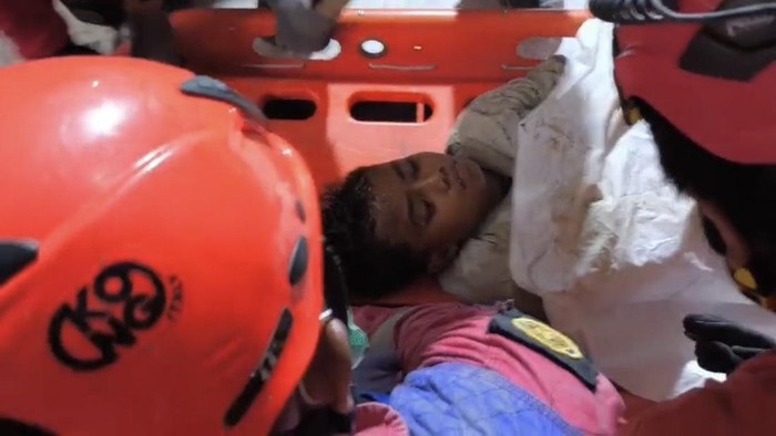 Haikal dievakuasi dengan tandu dan ditarik petugas pada Rabu (1/10) sore dalam kondisi yang lemas. Dia dalam keadaan sadar karena beberapa kali tampak mengedipkan mata tapi tidak merespons petugas yang memanggil-manggil namanya.