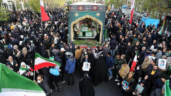 Iran – Ribuan warga berkumpul di Universitas Teheran dalam upacara pemakaman 100 personel keamanan yang tewas saat aksi protes di Iran.