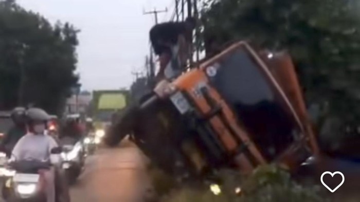 Truk mengalami tunggal di Jalan Raya Setu-Cileungsi, Kecamatan Cileungsi, Bogor, Jawa Barat (Jabar). Truk terguling akibat melintas di tanah yang amblas.